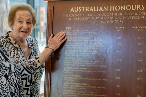 Ronnie had travelled back to Melbourne to share in the family celebrations for Helen’s 90th birthday on March 10. As a result, Helen and her sons had a special preview of the Honour Boards that will be officially unveiled on 1 June that recognise the 38 Korovians who have received Australian Honours.Helen was born in Poland in 1934 and following the Nazi occupation in 1939 she, along with her parents, were taken to the Bialystoker ghetto where she was able to survive with her parents for two years until the ghetto was liquidated on the 16th of August 1943. Unfortunately, that was the last time she saw them. Her uncle, who was a doctor, and her aunt, a nurse took her under their wing and together they spent the rest of the war in two work camps from where they were liberated in January 1945. Helen, together with her aunt and uncle, was sponsored by relatives to come to Australia and arrived in 1946.Fortuitously, the person who was teaching them English was a friend of Miss Dixon, Principal of Korowa from 1930 to 1949. Following an interview with Miss Dixon, Helen commenced at Korowa in May 1947 in Year 7 (Remove 7). She spent six happy years at the School and matriculated in 1952 and went on to gain a Bachelor of Arts from the University of Melbourne. Helen reflected on her years at Korowa where she said that she was fully accepted, her religion respected, made lifelong friends and where she learnt about Australian social mores. She even selected a football team to support – Carlton!