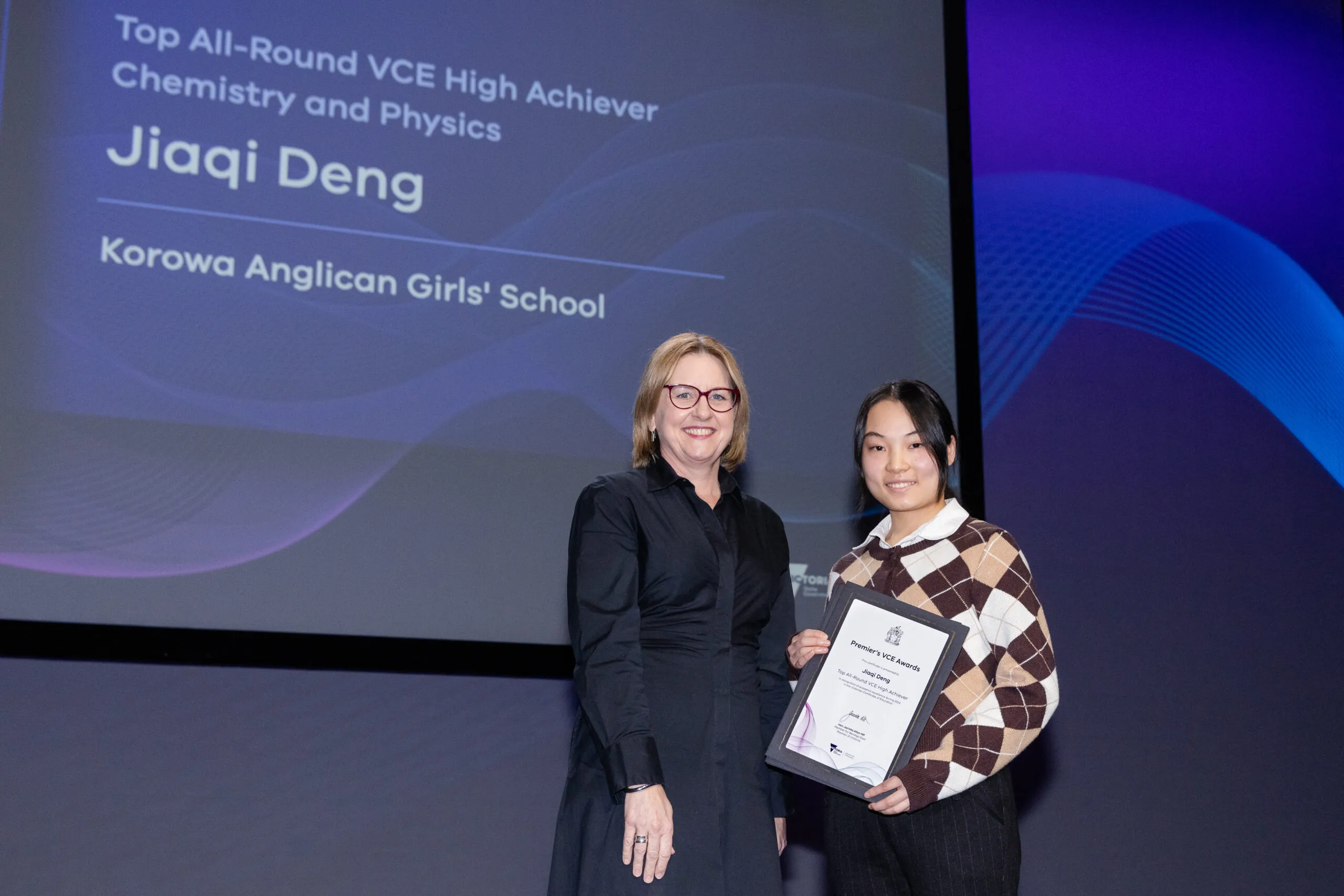 This week, the prestigious Premier's VCE Awards recognised the outstanding achievements of students in the Victorian Certificate of Education (VCE). Presented by the Victorian Premier, Jacinta Allan, the awards were presented to Victoria's top-performing 2024 VCE Students. Among those celebrated was Jacqueline Deng, Korowa’s VCE Dux for the Class of 2024, who received Premier's VCE Awards for Physics and Chemistry, as well as a Top All-Round VCE High Achievers Award. This highly regarded award acknowledges students who achieve scores of 46 or higher in five or more subjects in their final year of study, and we are incredibly proud of Jacqueline for earning this recognition. Jacqueline achieved an ATAR of 99.9, with perfect scores in Physics, Chemistry, and Specialist Mathematics, the latter of which she completed as part of her Year 11 studies.