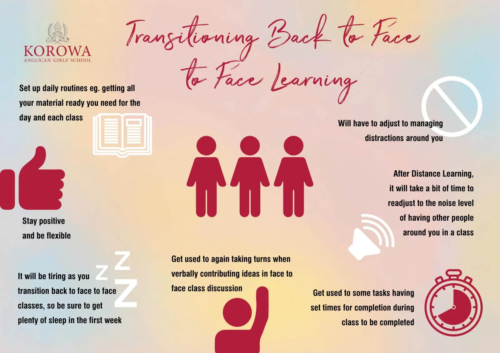 It was an absolute joy last week, standing at the gate greeting the first phase of returning students as they entered School.It’s hard to believe that for many of our students, they will have been engaged in online learning for about nine weeks by the time they return. Just as they adjusted to online learning, they will need to readjust back to a face to face classroom setting. Our VCE students were very excited to return and towards the end of last week I spoke to a number of students who were able to provide me with some great advice for our younger year levels as they return on 9 June. For many students, they have enjoyed the structure of the online learning lesson where they have had some ability to self-pace their learning by determining the effort and time spent on a task which often in a face to face lesson structure, are typically directed by the teacher. They also have had all their material close by for their classes so will need to be organised for physically moving between classrooms again. Online learning is also a lot quieter than a face to face classroom. Online discussion often takes place in Microsoft Teams channels, with just one person talking at a time or students posted written ideas and responses. For some students this means they may also have to get used to again posing questions and contributing to class discussions face to face.Here are the top tips as advised by some of our senior students: